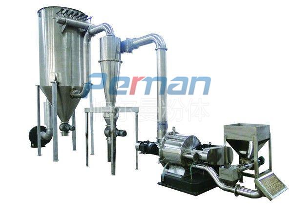 物料由加料系統(tǒng)均勻的送入粉碎室受到高速旋轉(zhuǎn)的粉碎盤(pán)的強(qiáng)烈沖擊,同時(shí)受到離心力的作用,與粉碎齒圈發(fā)生碰撞,受到剪切、摩擦、碰撞等多種綜合力的作用,使物料粉碎,被粉碎的物料隨氣流運(yùn)動(dòng)到分級(jí)區(qū),通過(guò)變頻調(diào)節(jié)的分級(jí)輪,對(duì)粗細(xì)物料進(jìn)行分離,符合細(xì)度要求的產(chǎn)品隨氣流進(jìn)入旋風(fēng)收集器和除塵器收集,粗物料返回分級(jí)區(qū)二次粉碎。