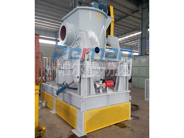 機體內腔為園筒形,上部份為超微分級機,下部分為超微粉碎機。粉碎室由粉碎盤和磨塊組成,用來將物料擊碎成細粉,分級室由分級葉輪組成,能把細粉分成粒度達標品和未達標品兩種規格,達標品經出料管排出,由旋風集料器收集。未達標品沿腔體內壁回落到粉碎室,繼續粉碎直到達標為止。